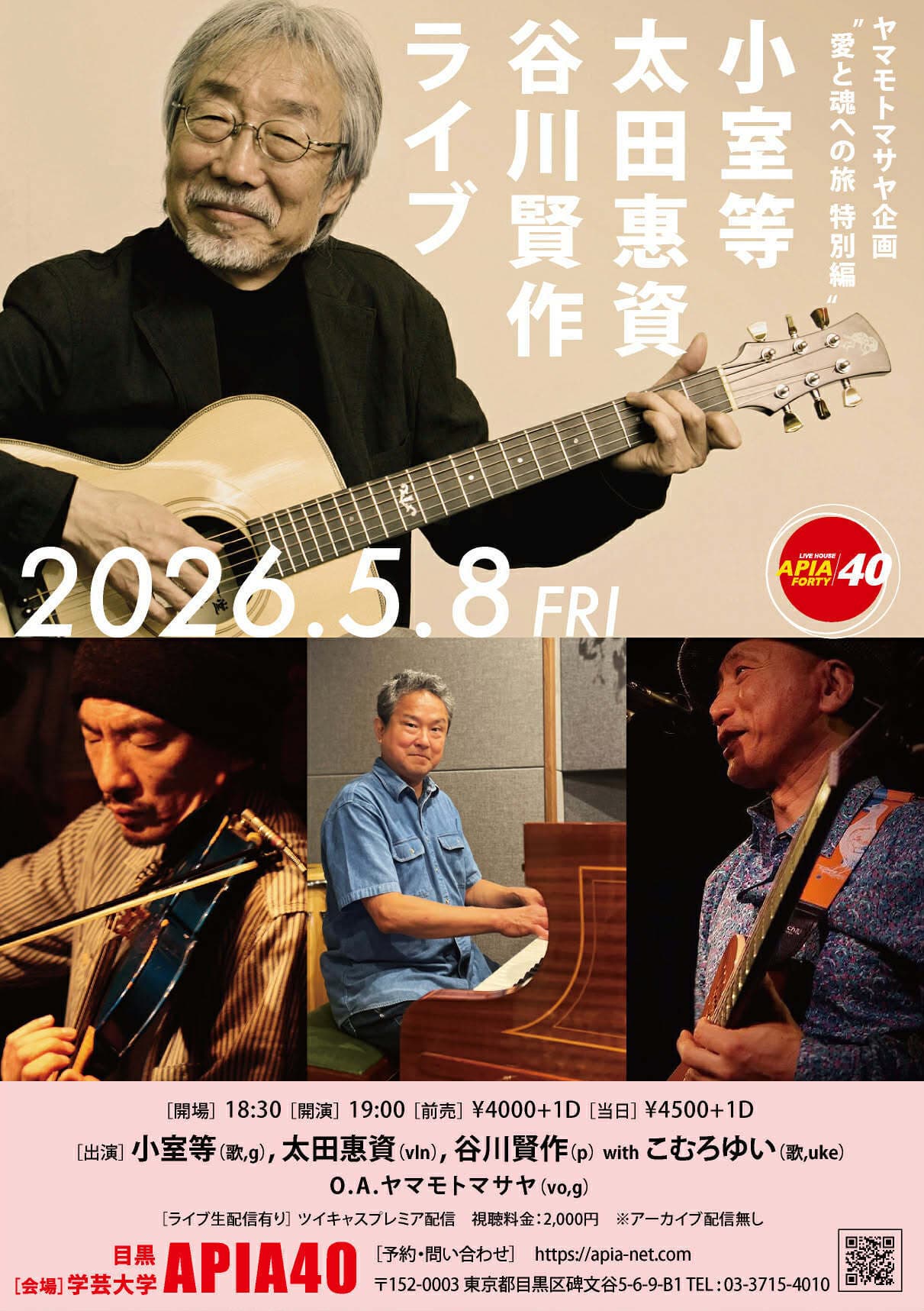 | 2026.3.18 リリース ヤマモトマサヤ企画 “愛と魂への旅 特別編” の開催が決定!! | 5/8(金)に、アピア40でのヤマモトマサヤ企画にて、日本フォーク界のレジェンド、小室等さんのトリオをお招きして、ワンマンライブを開催することになりました。詳細は、 Live Scheduleにて。 |
